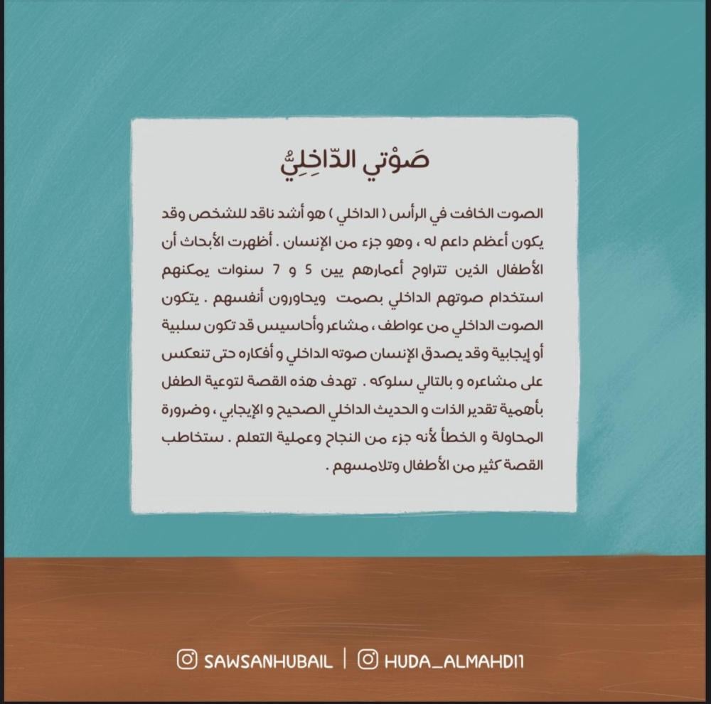 يتكون الصوت الداخلي من عواطف، مشاعر وأحاسيس قد تكون سلبية أو إيجابية وقد يصدق الإنسان صوته الداخلي وأفكاره حتى تنعكس على مشاعره وبالتالي سلوكه . تهدف هذه القصة لتوعية الطفل بأهمية تقدير الذات والصوت الداخلي وأفكاره حتى تنعكس على مشاعره وبالتالي سلوكه.